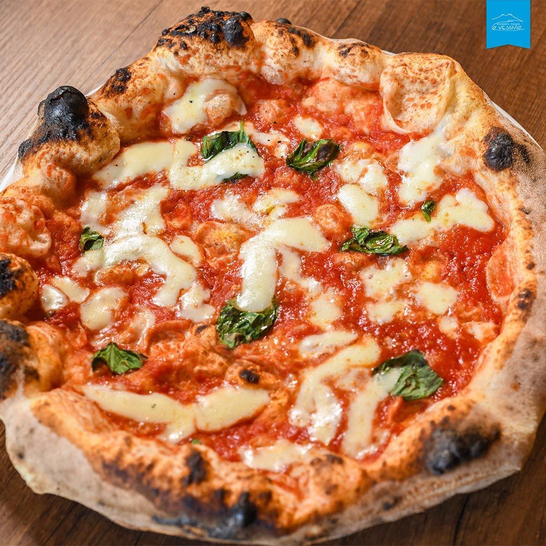 pizza fritta e al forno con pomodoro, mozzarella di bufala, basilico, olio e parmigiano